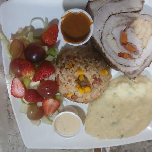 Plato Especial para Eventos Una opción deliciosa y versátil para tus celebraciones. Incluye puré cremoso, arroz mixto, ensalada tropical, cordon bleu bañado en una salsa especial, postre a elección y bebida. Ofrecemos porciones ajustables de proteína según el gusto de cada cliente, ideal para eventos personalizados con sabor y estilo.