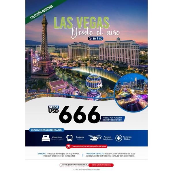 Déjate deslumbrar por la capital mundial del entretenimiento con este increíble plan de 4 días y 3 noches. Disfruta del brillo de sus hoteles, casinos y espectáculos, y eleva tu experiencia con un emocionante paseo en helicóptero que te permitirá admirar la ciudad desde las alturas. El paquete incluye alojamiento, traslados, asistencia médica y toda la diversión que solo Las Vegas puede ofrecer. El precio depende de las necesidades del cliente.