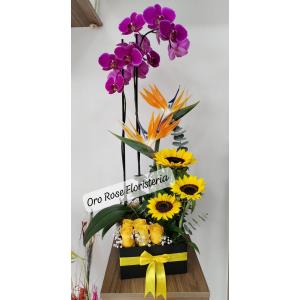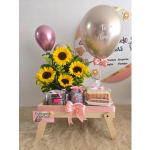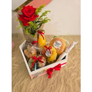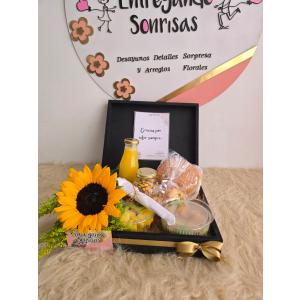 Un detalle único y sofisticado para sorprender a quien más quieres. Este desayuno viene en un elegante baúl de madera (color negro o natural, según disponibilidad) e incluye un delicioso sándwich de jamón y queso, jugo de naranja fresco, corazones hojaldrados, fruta picada de temporada, rollitos de jamón y queso, frutos secos y un hermoso girasol que ilumina el detalle con su frescura y alegría. 🍊🥪🌻