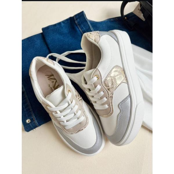 Modernos y versátiles, estos tennis son un imprescindible para cualquier look. Confeccionadas en tonos blancos y grises, destacan por sus detalles metálicos en dorado y plateado con un sutil estampado de serpiente, que les da un toque de sofisticación. Su diseño de plataforma ancha y cordones blancos no solo ofrece un look audaz, sino también una gran comodidad para caminar todo el día. Talla 38 nacional.