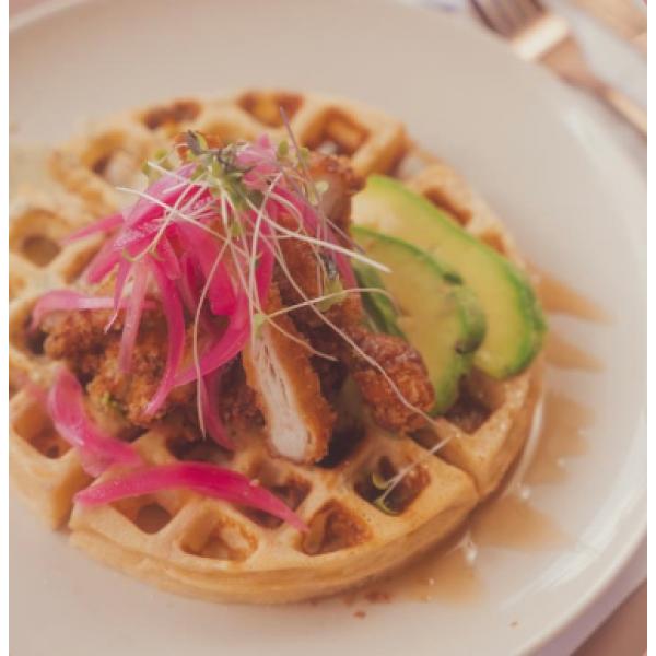 Base de waffle dulce con pollo crispy, miel picante, salsa ranch, aguacate y cebollas encurtidas.
