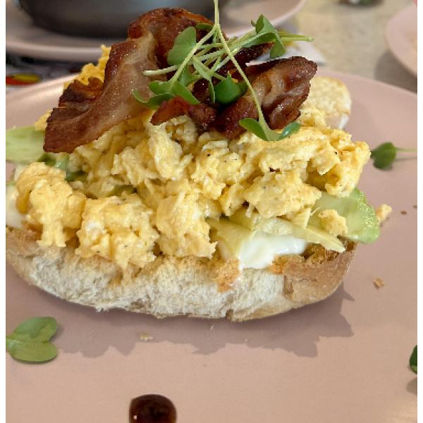Pan ciabatta con base de queso crema, huevos cremosos, tocino crocante y aguacate.