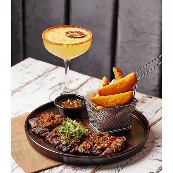 Solomo de res a la parrilla con chimichurri, acompañado de papas rústicas y queso parmesano.