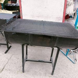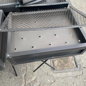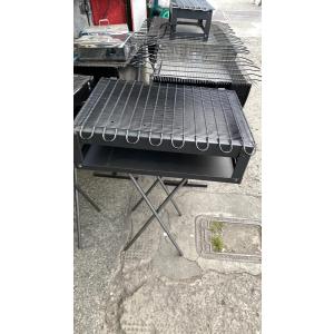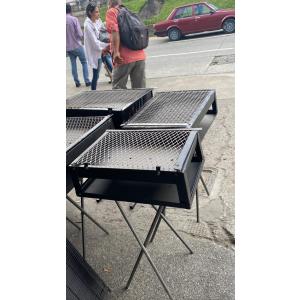 Práctico asador/parrilla de carbón de metal. Tiene patas plegables o desmontables y una rejilla amplia. Es perfecto para asar carnes en el patio, el campamento o como punto de venta rápido. Es fuerte y fácil de llevar.