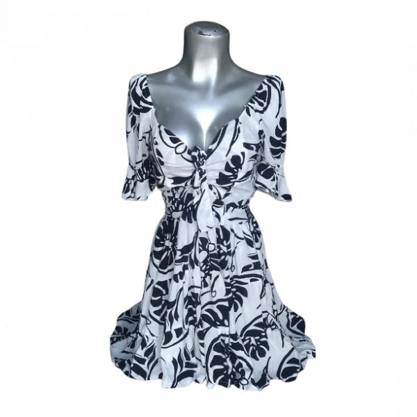 Captura todas las miradas con este coqueto vestido estampado blanco y negro. Su diseño con escote pronunciado, nudo frontal y falda con vuelo es perfecto para un look fresco y femenino en cualquier ocasión. Talla unica.