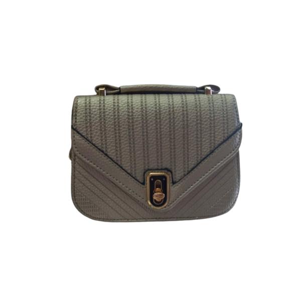Un mini bolso de mano sofisticado en un tono beige versátil. Su diseño texturizado con líneas en relieve y el elegante broche metálico dorado lo hacen perfecto para looks formales o de oficina.