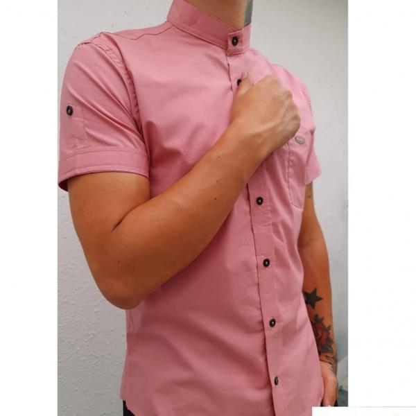 Camisa de hombre en un vibrante tono rosa con un moderno cuello mao o mandarín. El diseño de manga corta con presilla es ideal para climas cálidos.