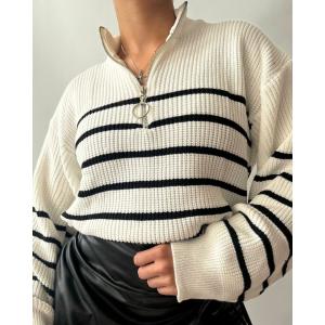 Suéter de punto grueso en color blanco con rayas horizontales, que evoca un clásico estilo náutico y preppy. Con un moderno cuello alto y media cremallera, es la prenda perfecta para un look deportivo, cómodo y muy a la moda.