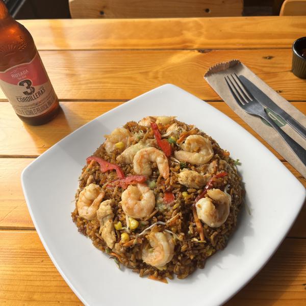 El clásico del wok. Combinación de pollo, cerdo, jamón, camarones salteados, maicitos, pimentón, raíces y verduras.