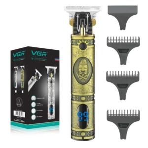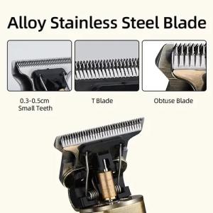 Máquina de corte inalámbrica con cuerpo metálico tallado y pantalla LCD. Cuenta con cuchillas de acero inoxidable tipo T para cortes precisos y una batería de litio de larga duración (hasta 300 minutos).