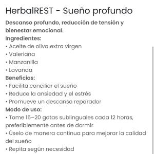HerbalREST - Sueño profundo Descanso profundo, reducción de tensión y bienestar emocional. Ingredientes: * Aceite de oliva extra virgen * Valeriana * Manzanilla * Lavanda Beneficios: * Facilita conciliar el sueño * Reduce la ansiedad y el estrés * Promueve un descanso reparador Modo de uso: * Tome 15-20 gotas sublinguales cada 12 horas, preferiblemente antes de dormir * Úselo de manera continua para mejorar la calidad del sueño * Repita según necesidad