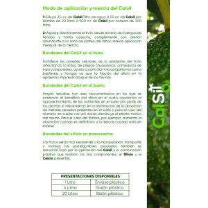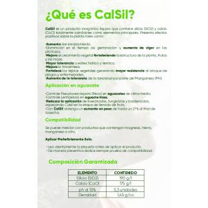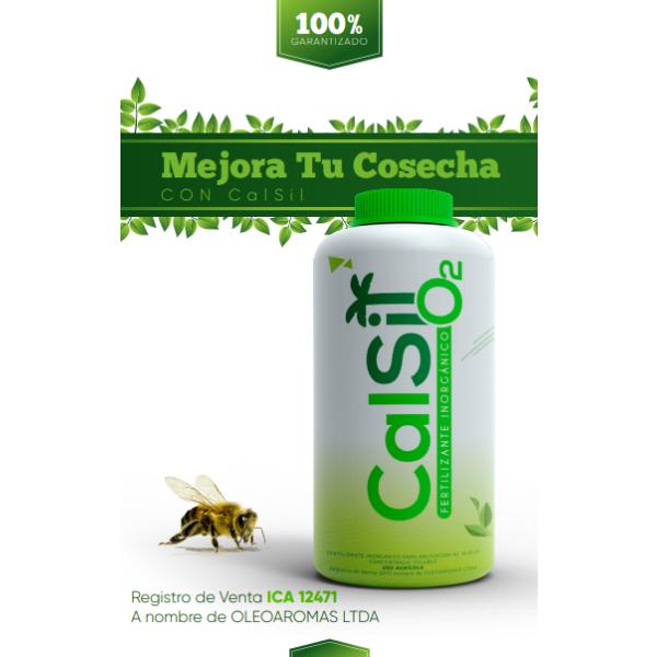 CalSil es un fertilizante inorgánico líquido distribuido por Oleoaromas Ltda. que combina silicio (SiO2) y calcio (CaO) para maximizar la productividad agrícola. Su fórmula fortalece la estructura vegetal, mejora la fotosíntesis y aumenta la resistencia ante plagas y estrés hídrico o térmico. En cultivos como el aguacate, incrementa el peso del fruto hasta un 27% y optimiza la durabilidad en poscosecha. Disponible en presentaciones de 1, 4 y 20 litros.