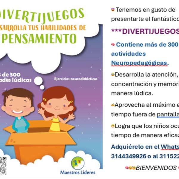 Divertijuegos, es un libro digital con más de 300 actividades neuropedagogícas, diseñado para estimular la atención y fortalecer la memoria de forma entretenida y dinámica. A través de actividades lúdica y retos visuales promueve el desarrollo de habilidades cognitivas clave mientras se aprende jugando. Ideal para acompañar procesos educativos en casa o en el aula. Recibelo de manera digital para trabajarlo desde el computador o de manera impresa.