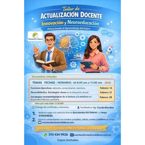 Potencia tu práctica educativa con nuestro Taller de Actualización Docente en Innovación y Neuroeducación. Un espacio virtual diseñado para fortalecer los procesos de enseñanza y aprendizaje, y potenciar estrategias pedagógicas desde la neuropedagogía. Aprende herramientas actuales, conecta con expertos y transforma tu forma de enseñar. Cupos limitados — inscríbete y sé parte del aprendizaje del futuro