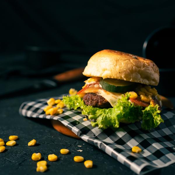 pan brioche lechuga, carne de la casa, queso, tocineta, maíz tierno, cebolla caramelizada, pepinillos salsas.