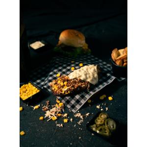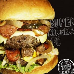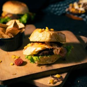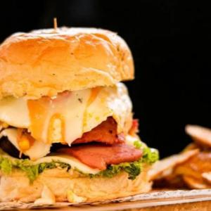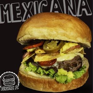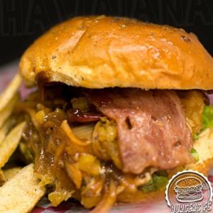 pan brioche, lechuga, carne de la casa, queso, tocineta, chorizo de ternera, guacamole, nachos, jalapeños, pepinillo, salsas y porcion de papas en casco.