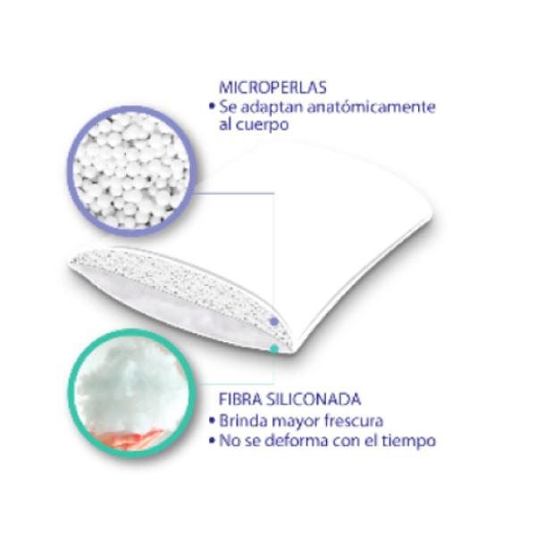 Las microperlas se acomodan anatómicamente al contorno de tu cabeza y cuello, brindando la máxima comodidad. La fibra siliconada brinda soporte y frescura. Contiene un sistema de 3 capas de diferentes telas que permite otorgarle mayor vida útil a la almohada y que se mantenga con la misma forma mucho mas tiempo.