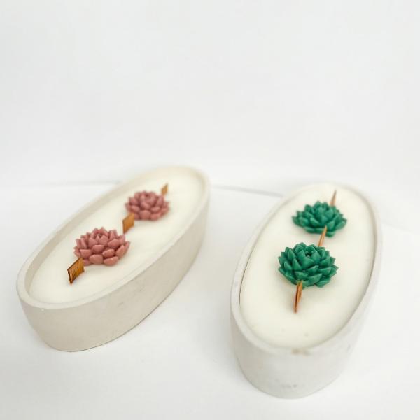 Vela aromática de 230 gramos de cera de soya, mechas de madera, en envase de canoa hecho en cemento 100% a mano, colores del envase y aroma a elegir.