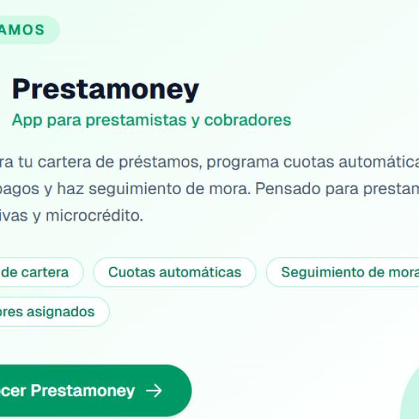 Prestamoney es una aplicación diseñada para prestamistas, cooperativas y microcréditos que buscan profesionalizar su operación. La herramienta permite administrar la cartera de préstamos, programar cuotas automáticas y registrar pagos de forma ágil. Además, facilita el seguimiento de mora y la organización de cobradores asignados, garantizando un control riguroso sobre el flujo de dinero y la recuperación de cartera desde una plataforma digital eficiente.