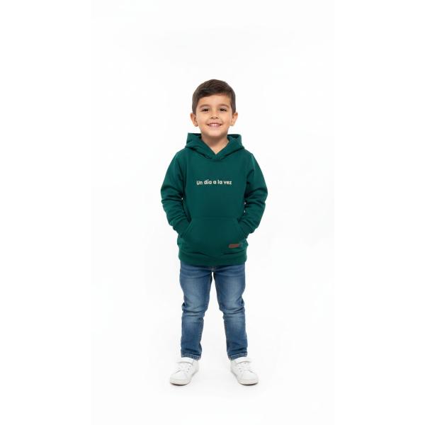 Buzo con capota infantil color verde botella, diseñado para brindar comodidad, abrigo y libertad de movimiento en el día a día. Confeccionado en materiales suaves y agradables al tacto, es ideal para mantener a los más pequeños cómodos y protegidos. Su diseño práctico y versátil lo hace perfecto para cualquier ocasión, combinando estilo y funcionalidad.