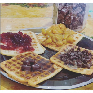 Waffles en sala de café con chips de chocolate o granitos de café Waffles con Mora Waffles con piña