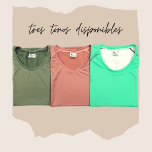 Camiseta deportiva con tecnología de transporte de humedad, secado rápido, anti manchas de sudor y protección solar. Tres tonos disponibles, verde oliva, salmón y verde claro.