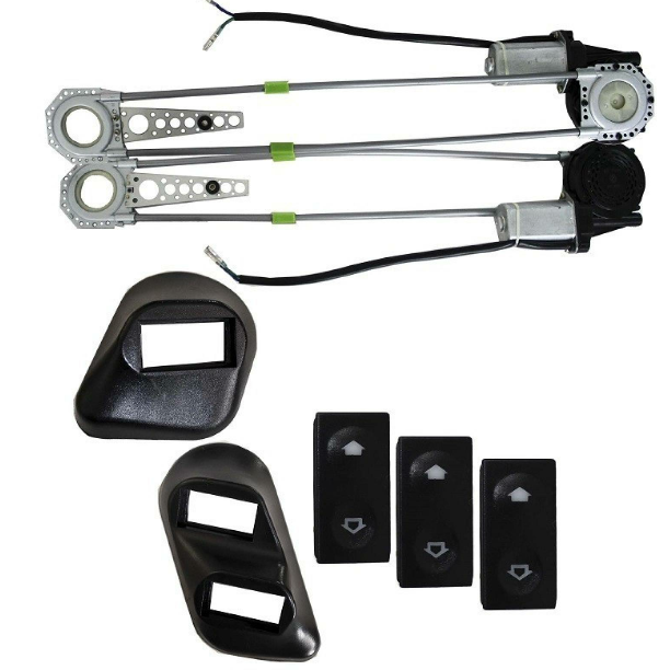 El juego de vidrios eléctricos incluye 2 motores de eleva vidrios, Guayas, cableado, 3 suiches 1 para la puerta del pasajero y 2para la del conductor.