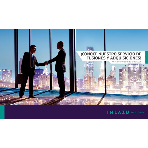 Los servicios de INLAZU Boutique de Inversión incluyen todo lo necesario para una efectiva venta, fusión o adquisición de una empresa, estaremos junto a usted desde la realización del diagnóstico previo, la valoración y estimación del rango del precio, el diseño del cuadernillo de venta, la búsqueda de potenciales compradores o vendedores, la evaluación de las ofertas, el proceso de Due Dilligence (Debida diligencia), la negociación integral de las condiciones para el cierre de la transacción.