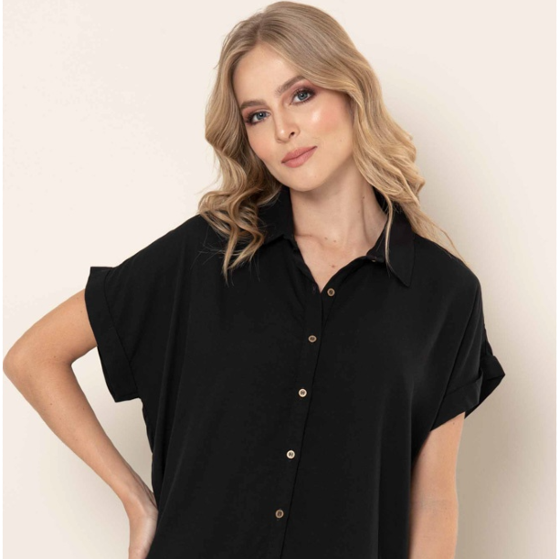 Camisa en chalis fondo entero, cuello y perilla con botones, manga rodada con guarda polvo, silueta amplia. Color Negro Tallaje XS,S,M,L,XL