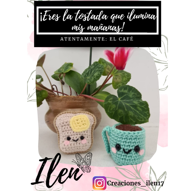 En la vida como un buen café se disgusta al 100 acompañado. La experiencia es única y llena de emociones. Creaciones ILEN, para esta ocasión te trae este mensaje: ¡Eres la tostada que ilumina mis mañanas! Att: El Café. En esta fecha de amor y amistad que bonito sería que por medio de estos amigurrumis nos recordaran los obstáculos superados, la anécdota que siempre recordamos, la primera experiencia de amor y amistad con tu persona favorita.