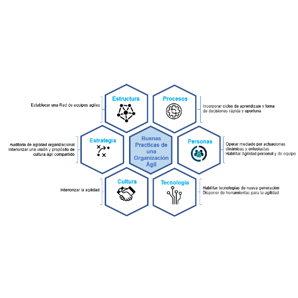 Una cultura de trabajo ágil para generar una mentalidad organizacional apoyada en procesos de aprendizaje dinámico en colectivos cross-funcionales para resolver problemas en contextos de incertidumbre. La cultura tiene que ver también con autoaprendizaje, agilidad, flexibilidad, escalabilidad y automatización.
