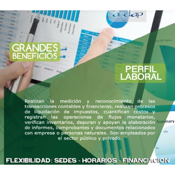 Realizan la medición y reconocimiento de las transacciones contables y financieras, realizan procesos de liquidación de impuestos, cuantifican cosotos, y registran lasoperaciones de flujos monetarioas, verifican inventarios, depuran y apoyan la elaboración de informes, comprobantes y documentos relacionados con la empresa o personas naturales. Son empleados por el sector público y privado. Flexibilidad: sedes, horarios y financiación.