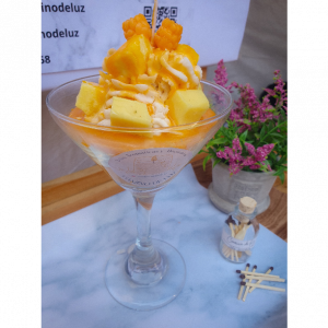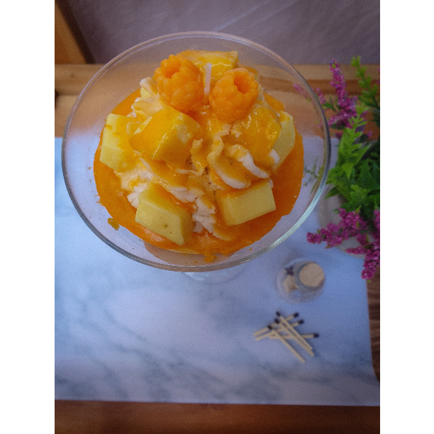 La vela de Smoothie de Mango es una excelente opción para ambientar cualquier espacio con un aroma dulce y afrutado. Esta hecha con cera de soja y tiene la forma de una copa con una base de crema de mango y trozos de mango bañados en salsa aroma frutal. Al encenderla, la cera comienza a derretirse y se libera un delicioso aroma que evoca el sabor fresco y frutal. Puedes personalizarla con el aroma que prefieras.