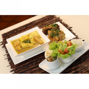 Solomo de res (madurado, corte en cuadros 250gr) al wok (con ajonjolí), acompañado con papas doradas en cascos, arroz blanco, ensalada de aguacate y tomate, con vinagreta de cilantro